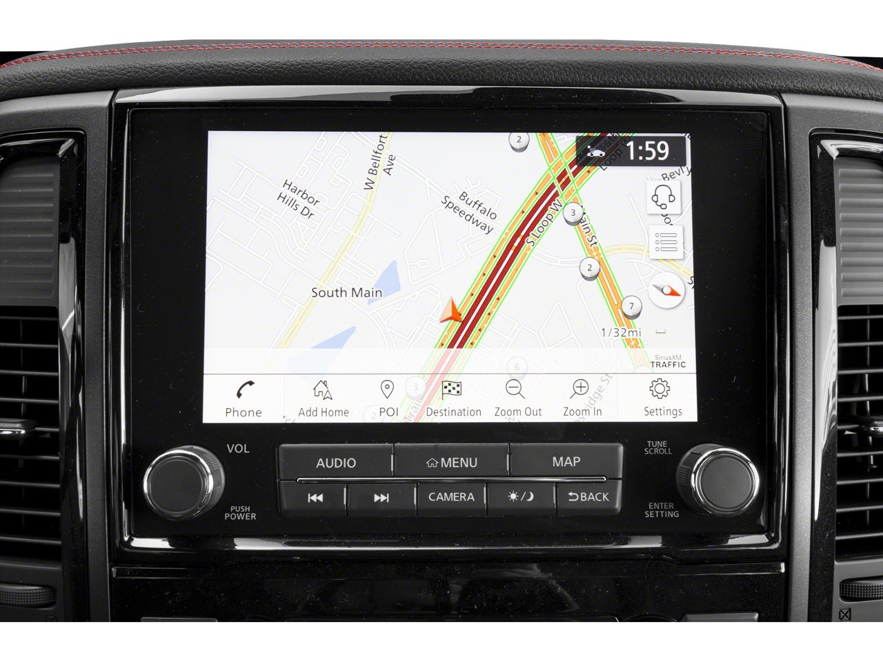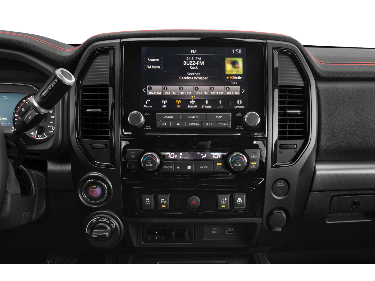 - Radio: NissanConnect w/Navigation -inc: 9" touchscreen display, 6 speakers, Apple CarPlay, Android Auto, HD Radio, SiriusXM satellite radio, SiriusXM Traffic, SiriusXM Travel Link w/weather, fuel prices, movie listings, stock info, TomTom weather, Nissan door to door navigation w/3D building graphics and satellite imagery, online POI search, over-the-air map updates and online premium traffic information, 2-USB (1 type A, 1 type C) connection ports for iPod interface and other compatible devices, 2 USB A ports (charge only), Bluetooth® hands-free phone system, streaming audio via Bluetooth®, hands-free text messaging assistant, Nissan Connect services, WiFi hotspot, Nissan voice recognition for navigation and audio, Siri Eyes Free and follow me home function