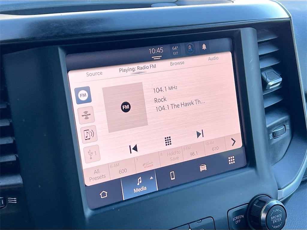2 Way Rear Headrest Seat, 2nd Row In Floor Storage Bins, 4 Way Front Headrests, 40/20/40 Split Bench Seat, 4G LTE Wi-Fi Hot Spot, 8.4 Touchscreen Display, Apple CarPlay, Auto Power-Folding Mirrors, Big Horn IP Badge, Black Exterior Mirrors, Bluetooth® Handsfree Phone & Audio, Center Hub, Connectivity - US/Canada, Dual Glove Boxes, Exterior Mirrors Courtesy Lamps, Exterior Mirrors w/Heating Element, Exterior Mirrors w/Supplemental Signals, Foam Bottle Insert (Door Trim Panel), Footwell Courtesy Lamp, For Details, Visit DriveUconnect.com, For More Info, Call 800-643-2112, Forward & Reverse Utility Lights, Front Armrest w/Cupholders, Front Center Seat Cushion Storage, Front Fog Lamps, Front Seat Back Map Pockets, Global Telematics Box Module (TBM), Glove Box Lamp, Google Android Auto, GPS Antenna Input, Integrated Center Stack Radio, Integrated Voice Command w/Bluetooth®, Leather Wrapped Steering Wheel, Level 1 Equipment Group, Level 1 Equipment Group w/2_Y, Locking Lower Glove Box, Lone Star IP Badge, Manual Adjust 4-Way Front Passenger Seat, Mirror Running Lights, Power 2-Way Driver Lumbar Adjust, Power Adjust 8-Way Driver Seat, Power Adjust Mirrors, Power Adjustable Convex Aux Mirrors, Power Heated Fold Telescope Mirrors, Power Telescoping Mirrors, Premium Cloth 40/20/40 Bench Seat, Quick Order Package 2HZ Big Horn, Radio: Uconnect 5 W w/8.4 Display (A62), Rear 60/40 Folding Seat, Rear Dome w/On/Off Switch Lamp, Remote USB Port - Charge Only, Selectable Tire Fill Alert, SiriusXM Radio Service, SiriusXM Satellite Radio, Steering Wheel Mounted Audio Controls, Storage Tray, Wheels: 18 x 8.0 Polished Aluminum.